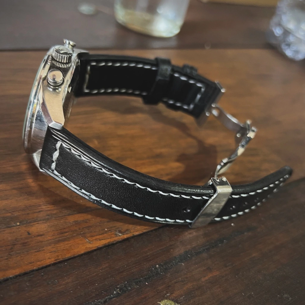 Para a produção das pulseiras de couro, é fácil obter a medida do encaixe do seu relógio a partir do uso de uma régua ou paquímetro, como o exemplo abaixo: