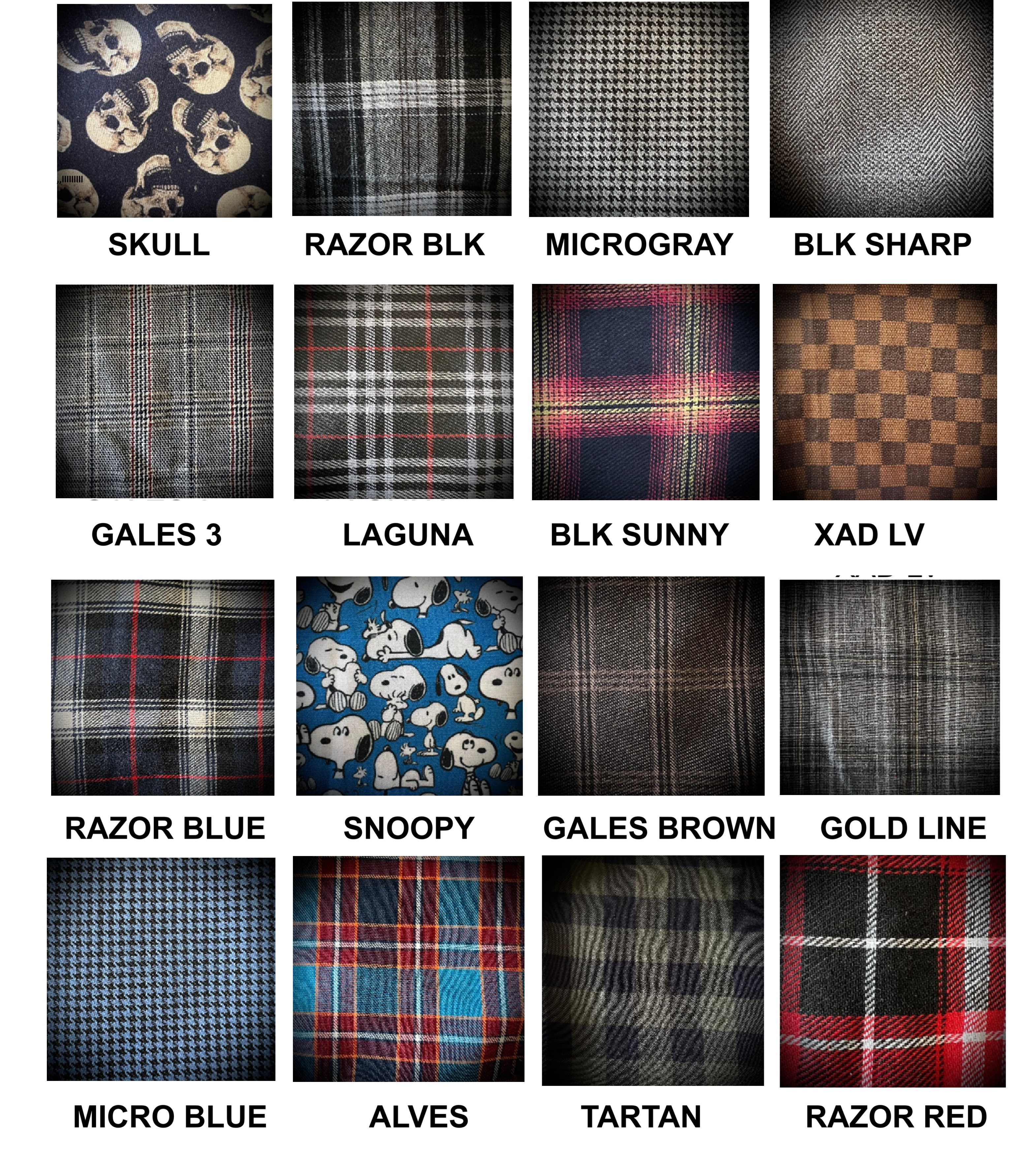 Nossos desenhos vão desde padrões em xadrez, figuras geométricas, cores sólidas básicas ou até personagens.
